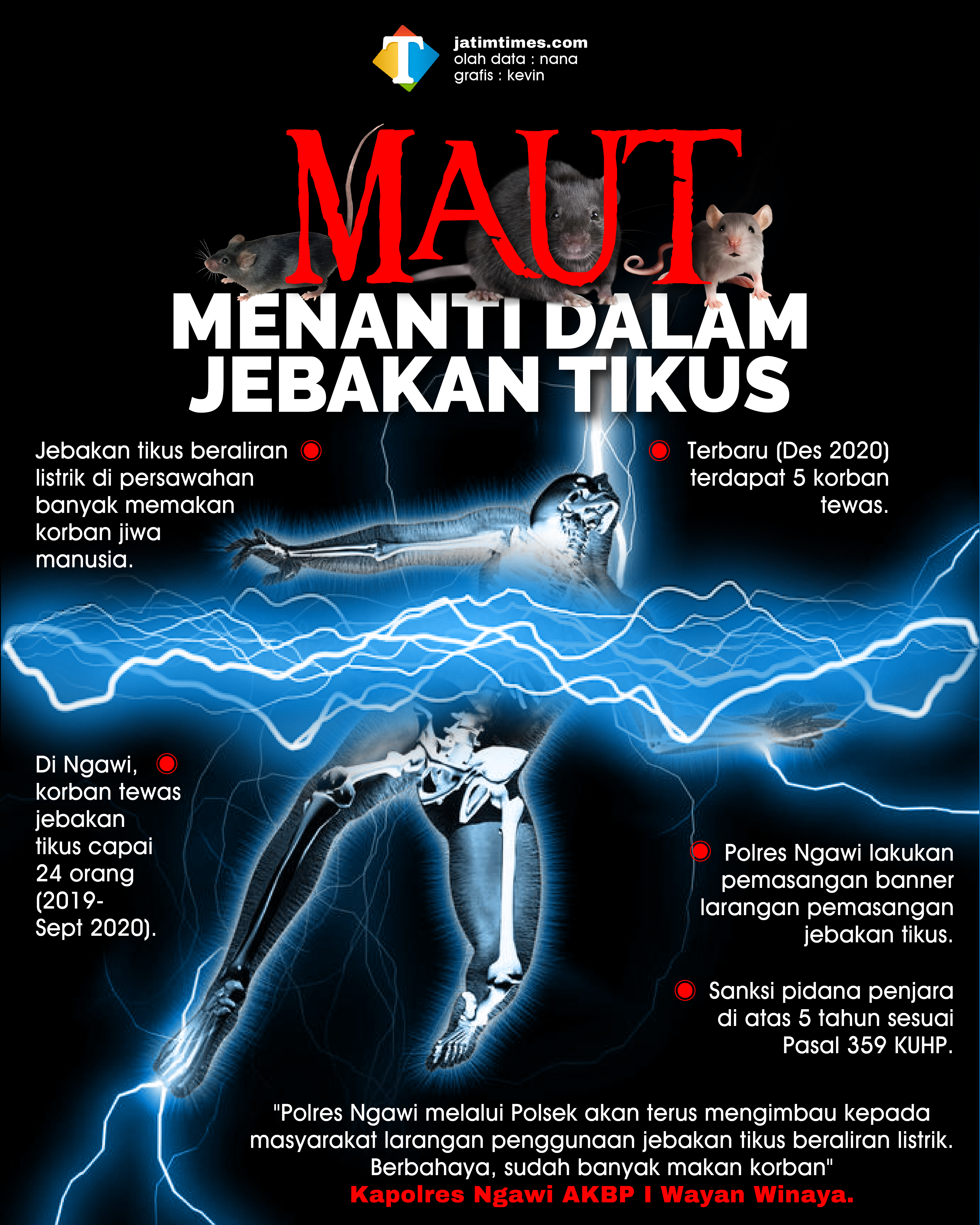 "Polres Ngawi melalui Polsek akan terus mengimbau kepada masyarakat larangan penggunaan jebakan tikus beraliran listrik. Berbahaya, sudah banyak makan korban" ujar Kapolres Ngawi AKBP I Wayan Winaya.