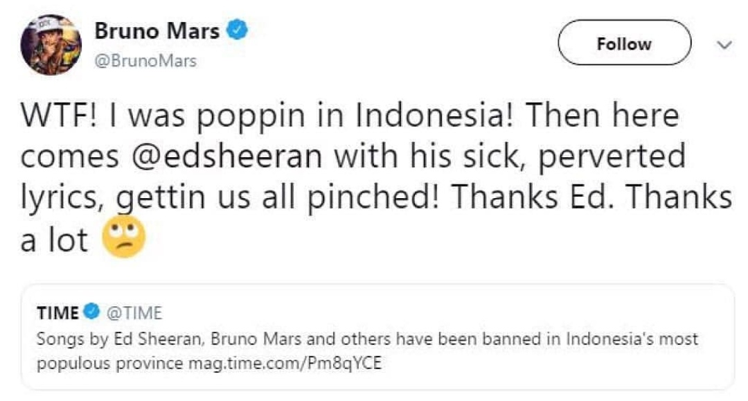 "WTF! I was poppin in Indonesia! Then here comes @edsheeran with his sick, perverted lyrics, geetin us all pinched! Thanks Ed. Thank a lot" tulis akun @brunomars.