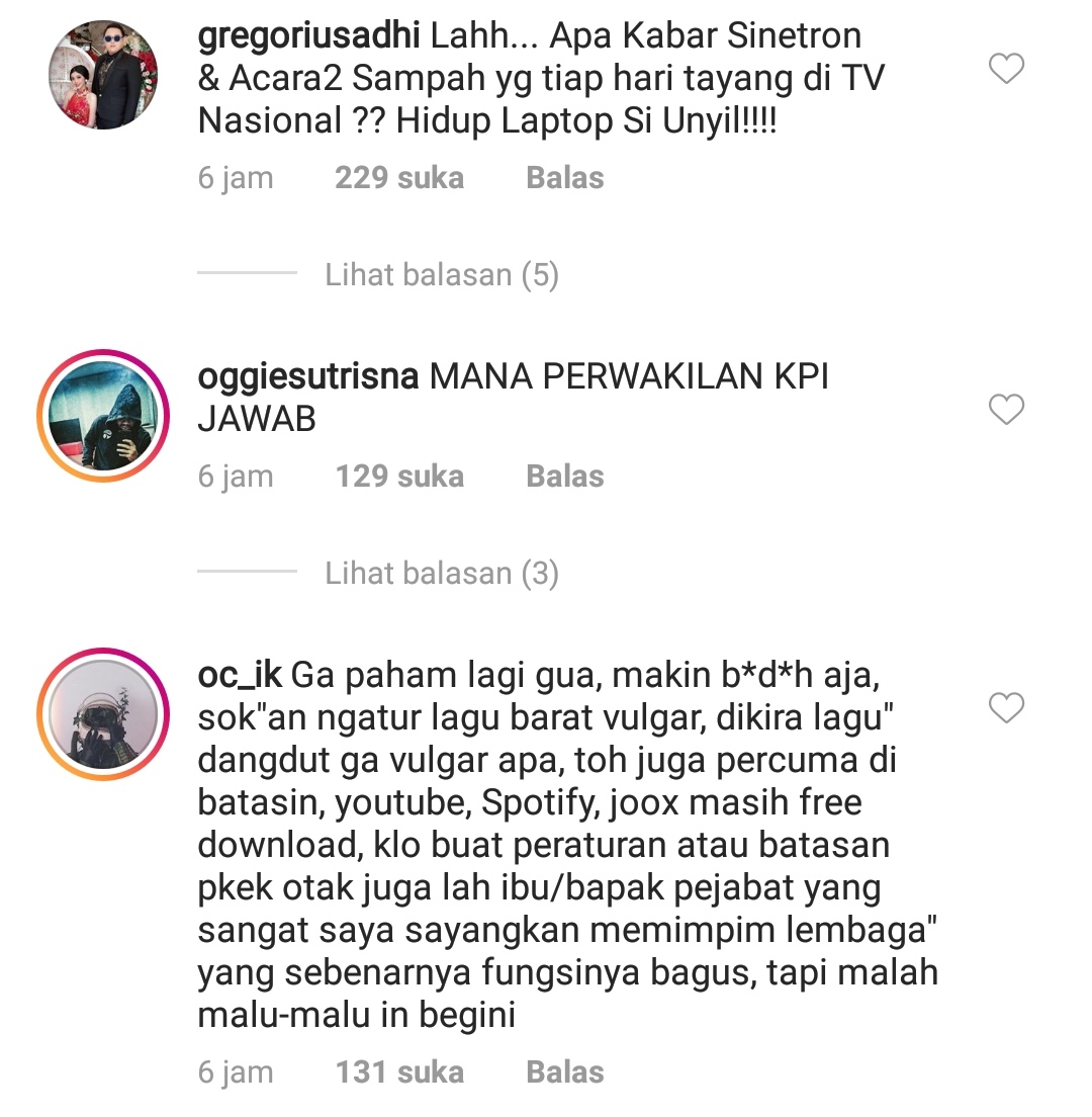 Akun lainnya secara langsung bahkan menyerang KPI, seperti yang dituliskan oc_ik :"Ga paham lagi gua, makin b*d*h aja sok-sok an ngatur lagu barat vulgar. Dikira lagu-lagu dangdut tidak vulgar apa. Toh juga percuna dibatasi. Youtube, Spotify,Joox masih bebas download. Kalau buat aturan atau batasan pake otak juga lah ibu/bapak pejabat yang sangat saya sayangkan memimpin lembaga-lembaga yang fungsinya sebenarnya bagus. Tapi malah malu-maluin begini," ujarnya.