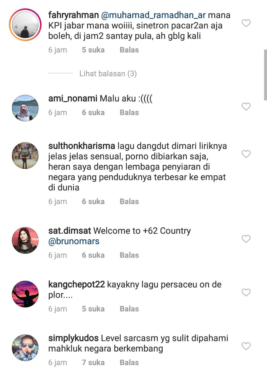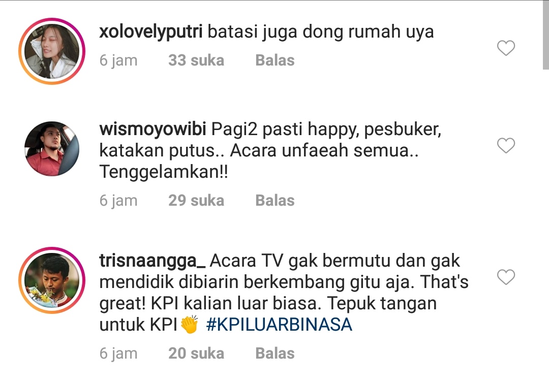 Banyak komentar warganet yang menyayangkan kebijakan KPI yang menurut mereka sangat mundur sekali. Bahkan terkesan seperti pepatah lama, "Gajah dipelupuk mata tidak terlihat, semut dikejauhan begitu tampak,".
