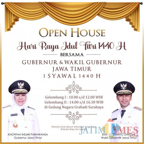 Gubernur Jawa Timur, Khofifah Indar Parawansa akan menggelar open house pada hari pertama Idul Fitri (Rabu, 5 Juni 2019) bertempat di Gedung Negara Grahadi Surabaya.