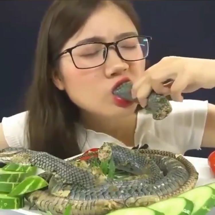 Seperti halnya video berdurasi selama satu menit yang diunggah dalam akun twitter @rezaauliaunseorang wanita yang melakukan mukbang makan ular kobra. Terlihat ular itu sudah dimasak diletakkan di atas meja sebuah piring.